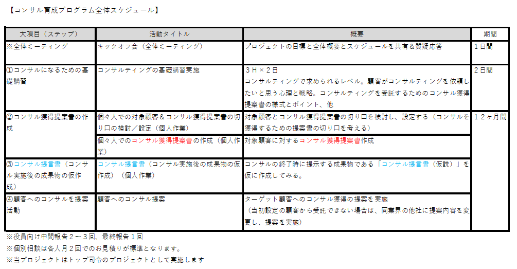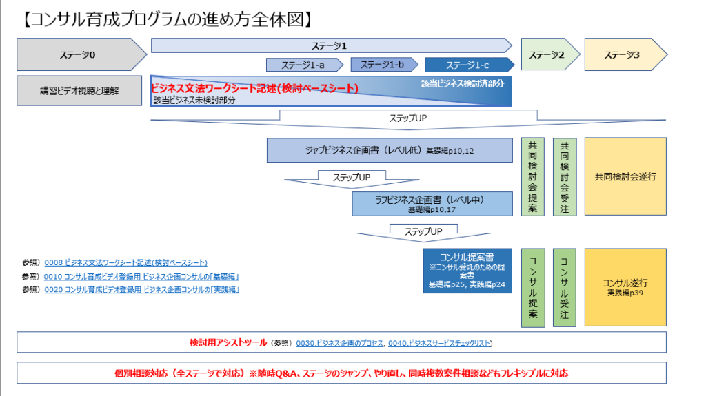 講習で基本ノウハウを取得し、個人別の個別相談会を通して、個々人のスキルアップだけでなく、実際にビジネス企画コンサルティングを受託するまでをサポートするプログラムです。